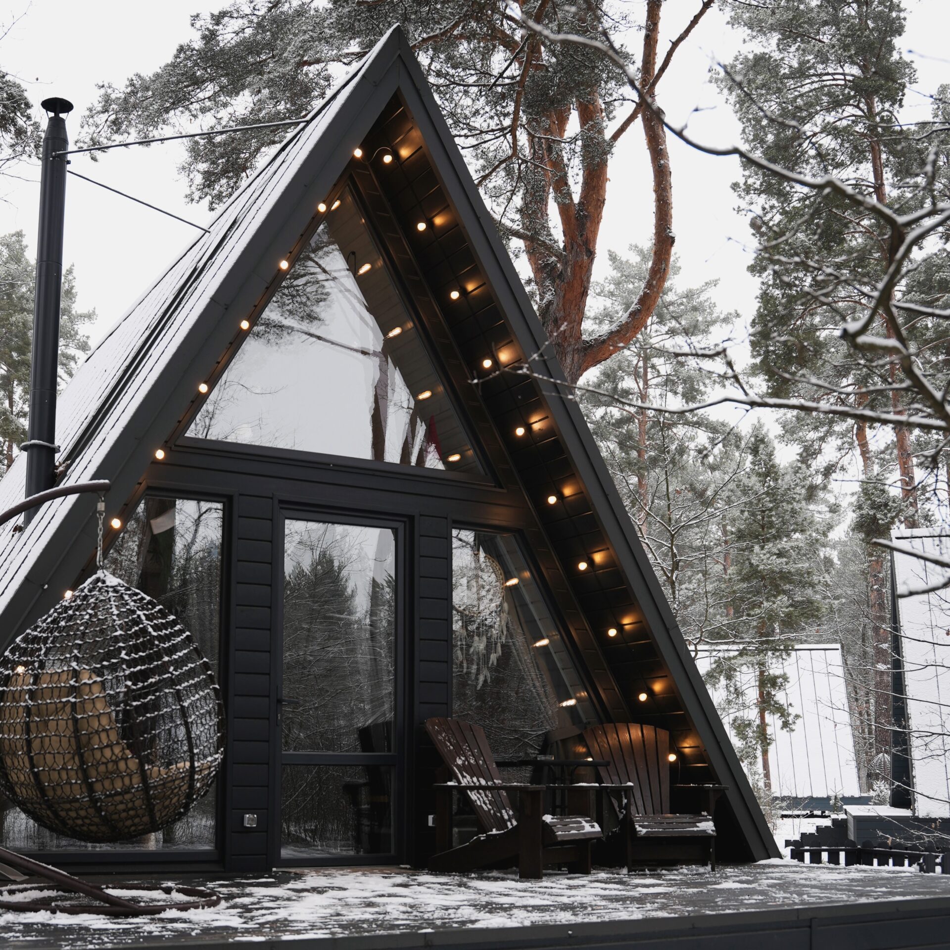 Будинок A-frame має 2 поверхи з панорамними вікнами.